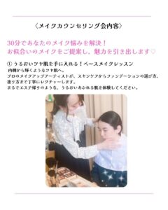 短い時間で気になる部分をしっかり相談でき、ベースメイク・眉ケアを中心としたメイクイベントです