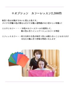 またご希望の方には〈オプション・・カラーレッスン¥2,200〉もご用意しています 自分に似合うカラーとメイクを知る事でより若々しく明るい印象に♪♪ 楽しみながら学べるレッスンとなっております(^^♪